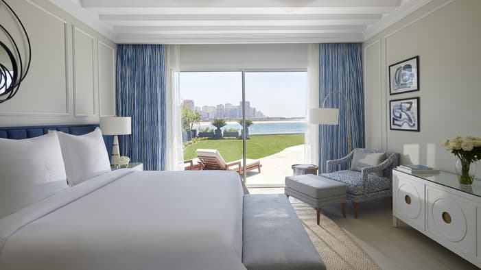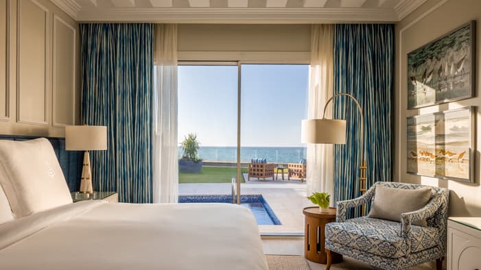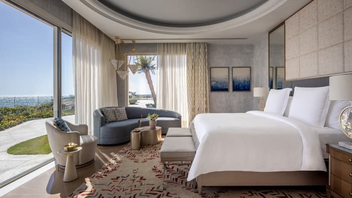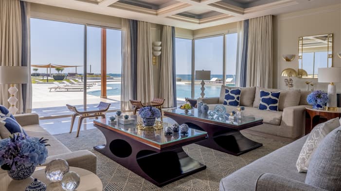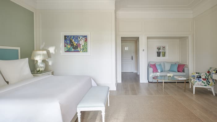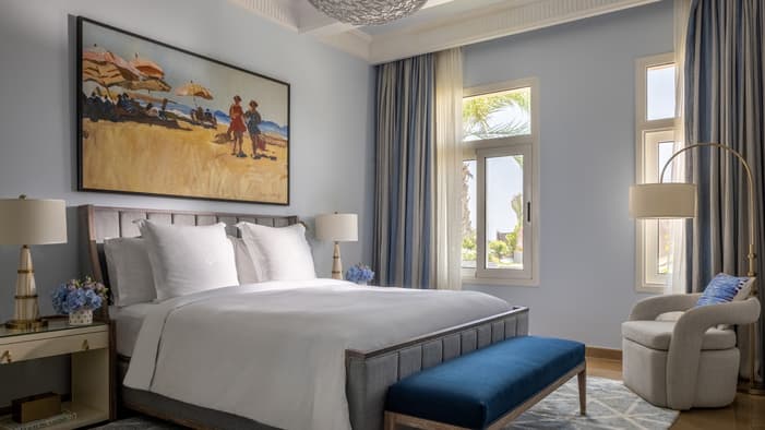 Experience the glamour of our coastal Resort, featuring a seafront with an assortment of rooms, beach suites and sea-view villas with private pools, as well as a palace. Each room and suite is inspired by European-Mediterranean style, showcasing a colour palette that spans from cool pastels to the vivid tones of the sea. The artful décor includes paintings and sculptures that evoke the essence of summer beach holidays, complemented by views of the sea and sky.