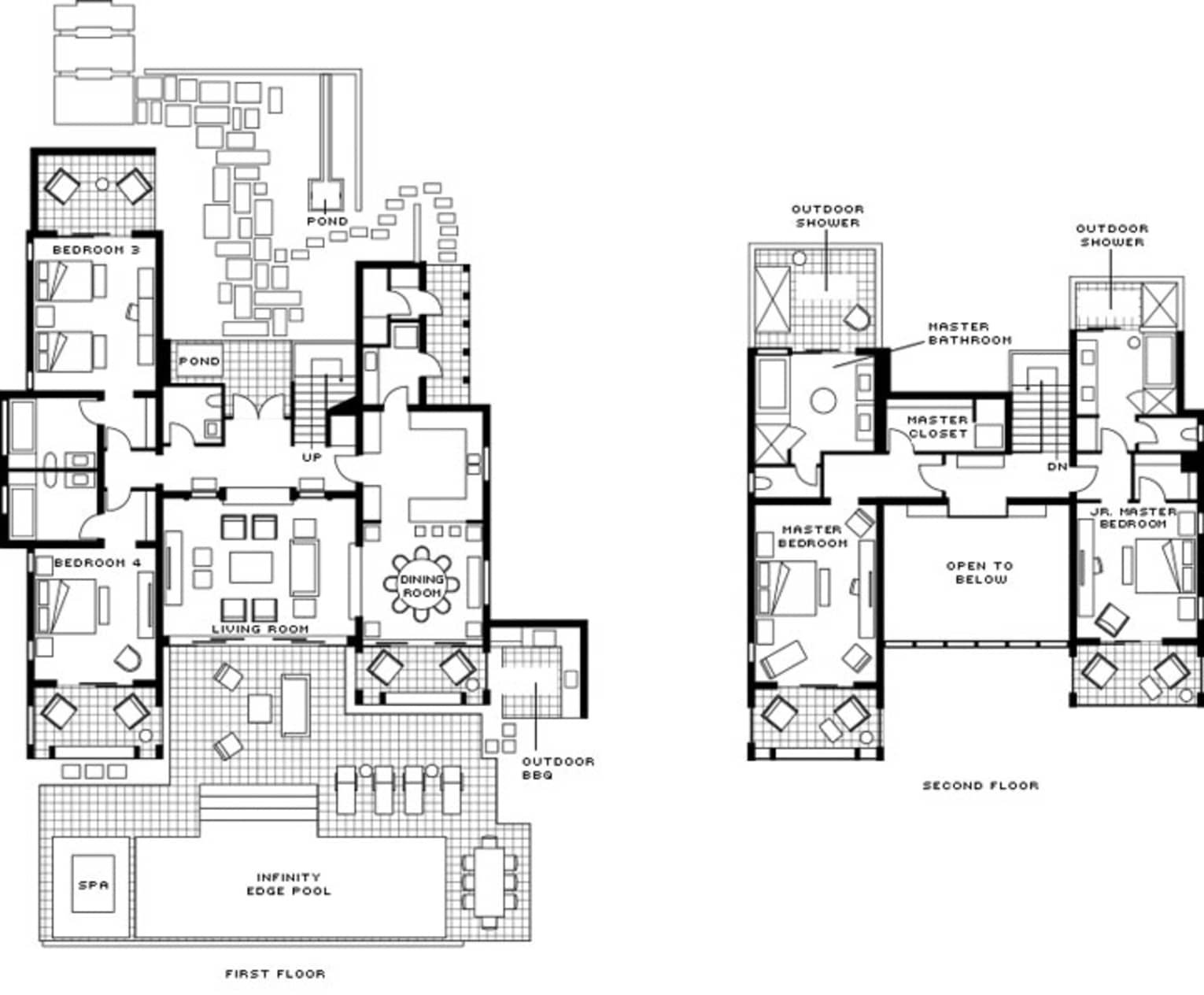 Four and a half marble bathrooms with double sinks, soaking tub, walk-in shower and two outdoor showers