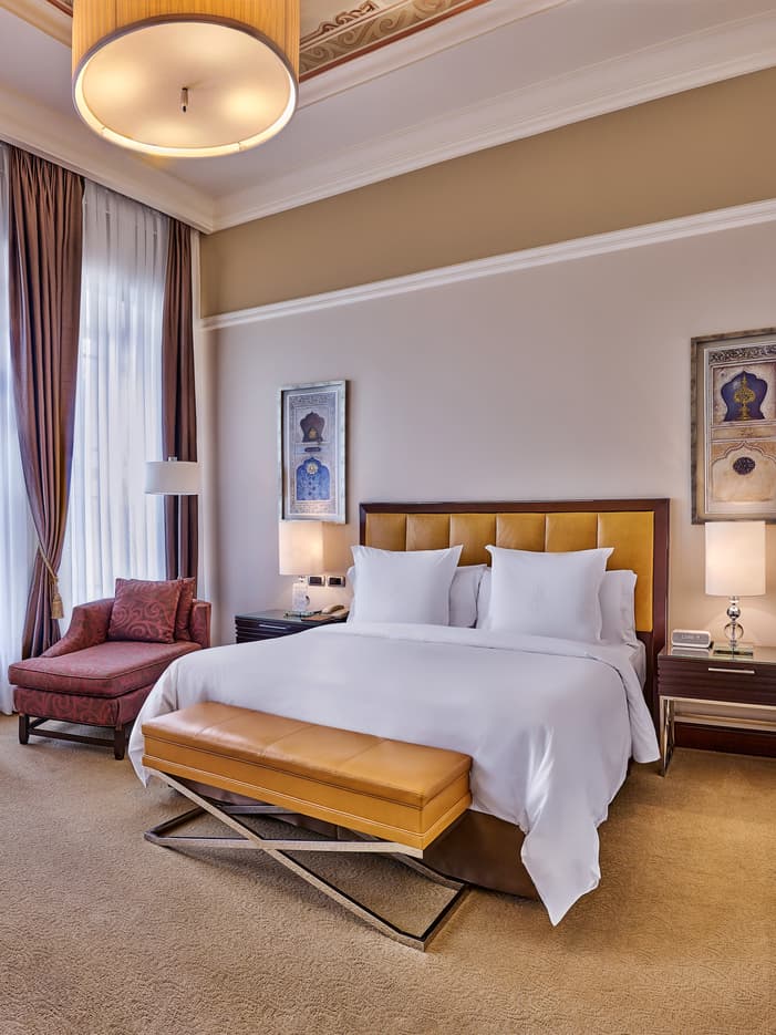مزيج من التصميم العصري والتصميم التركي العثماني الأصيل، مُزيّن بالألوان الزرقاء الغامقة أو الحمراء الفاتحة مع لمسات نحاسية وعنابية، بالإضافة إلى المفروشات الناعمة المُصممة خصيصًا لفورسيزونز والأثاث المصنوع من خشب الماهوجني باللون البُني المائل إلى الحمرة.