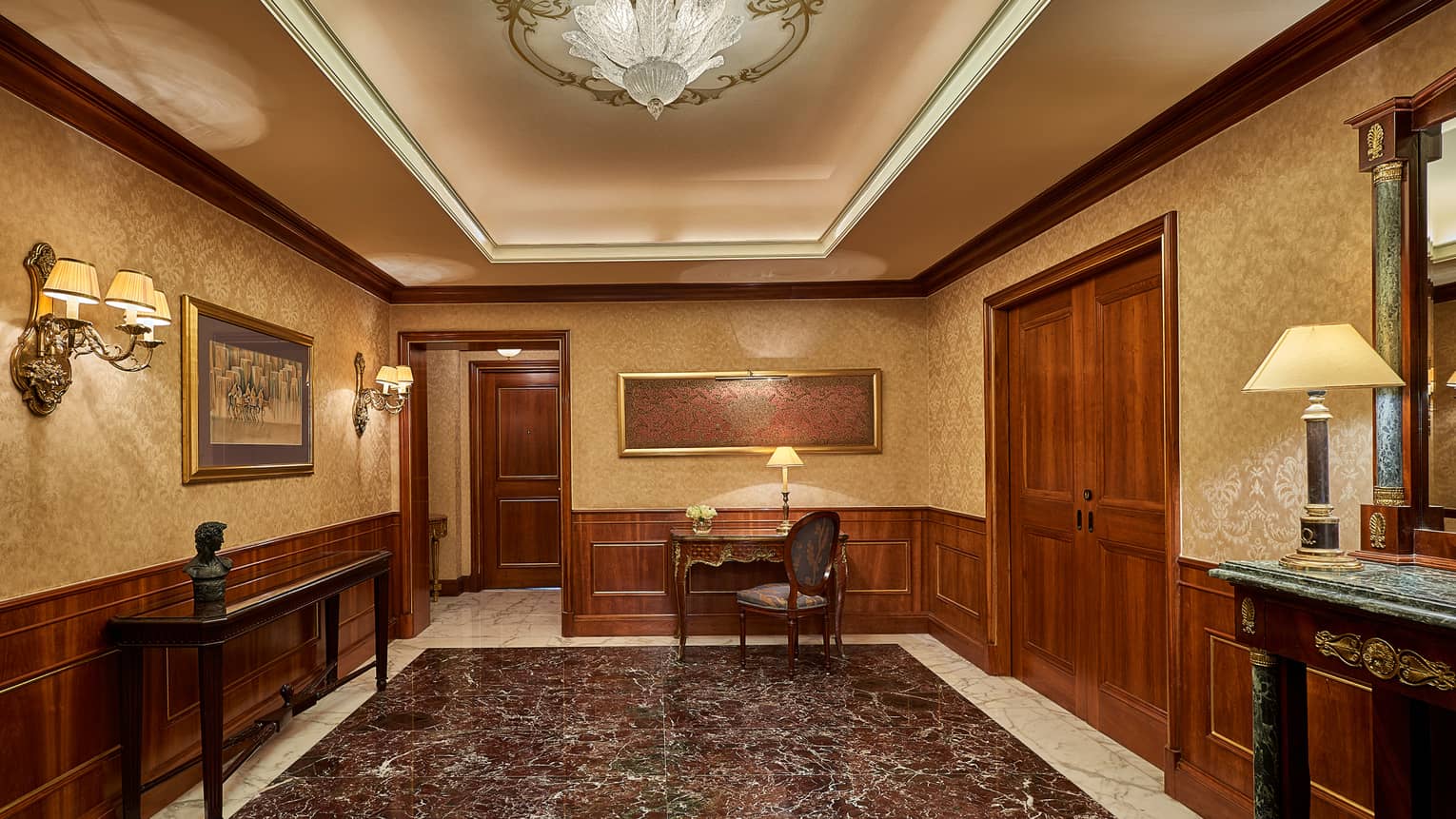اللمسات الفاخرةتضيف الأعمال الفنية الآسرة، والأثاث المنحوت بدقة، والأزهار العطرة، الدفء إلى هذه الأجنحة ذات الطراز السكني.