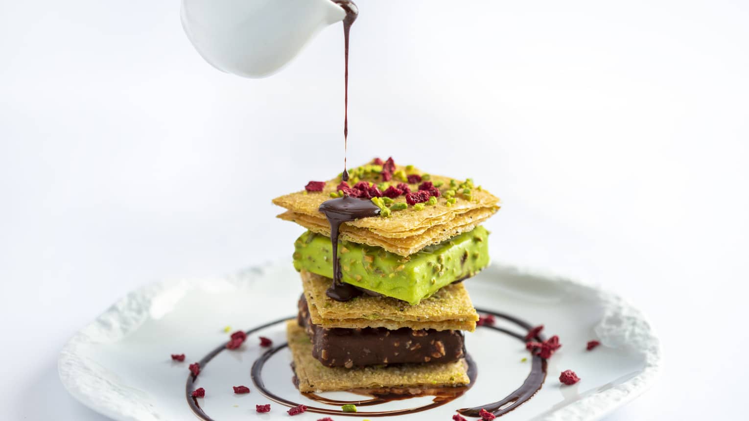 أتَينا بهذه الأكلة اللذيذة من أجلكم حيث الطَّعم الجميل والشعور الرائع. أعيدوا الوصال مع أحبائكم من خلال مشاركة البقلاوة بالآيس كريم، وهي Masterdish لذيذ من إعداد الشيف الكبير محمد سليم. تتوفر البقلاوة بالآيس كريم في ذا تيراس، وتُعد أحد أطباقنا المُميزة المصنوعة من آيس كريم الفستق والشوكولاتة ومعجنات فيلو وصوص الشوكولاتة.