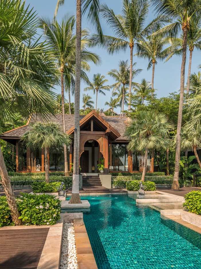 Contemporary southern Thai–style interiors. Tropical rosewood furnishings highlight custom-made artwork.