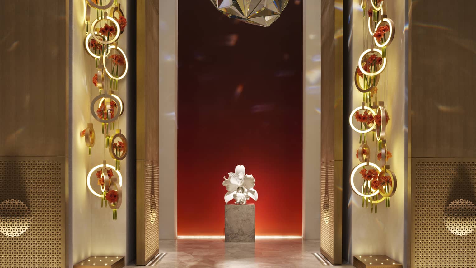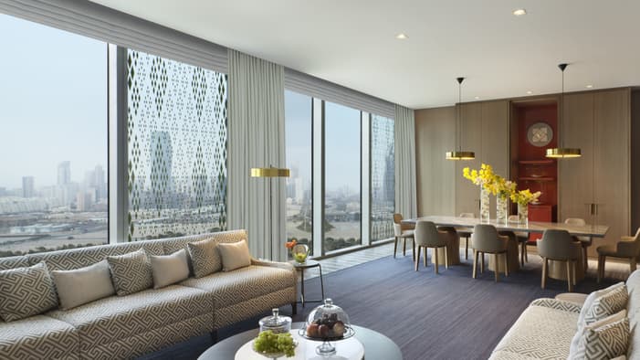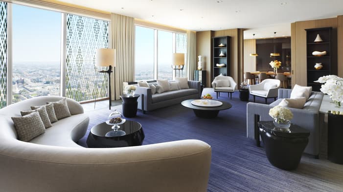 تعكس الومضات البرتقالية المحروقة مناظر غروب الشمس في الخليج بينما تستحضر الظلال النيلية الناعمة سماء الصحراء المُرصّعة بالنجوم في الجناح الأميري، والذي يجمع بين مناظر أفق المدينة المتلألئة مع لمسات تصاميم فنية تحت الأسقف المرتفعة التي يبلغ ارتفاعها 3.5 متراً (11.5 قدماً).