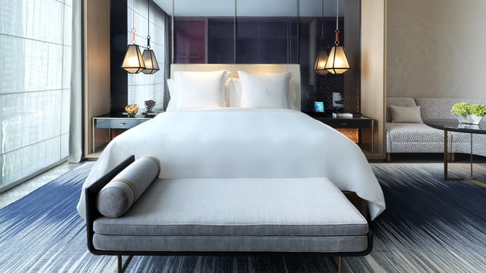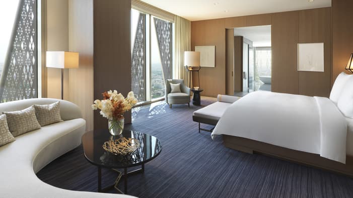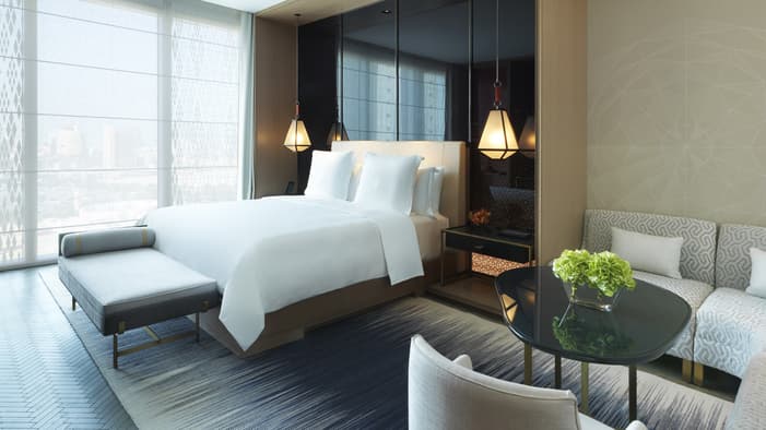 تشتمل هذه الملاذات الهادئة المُبهرة ذات التصاميم الساحرة على منطقة جلوس وحمام رخامي كبير به حوض استحمام مُستقل وتلفزيون في المرآة، بالإضافة إلى إطلالات مبهرة على حوض السباحة ومناظر المدينة من الطابق الخامس إلى التاسع عشر المُمتدة عبر مياه الخليج إلى ما لا نهاية. كما تتوفّر خيارات الأسرّة المتصلة والأسرّة المنفصلة.