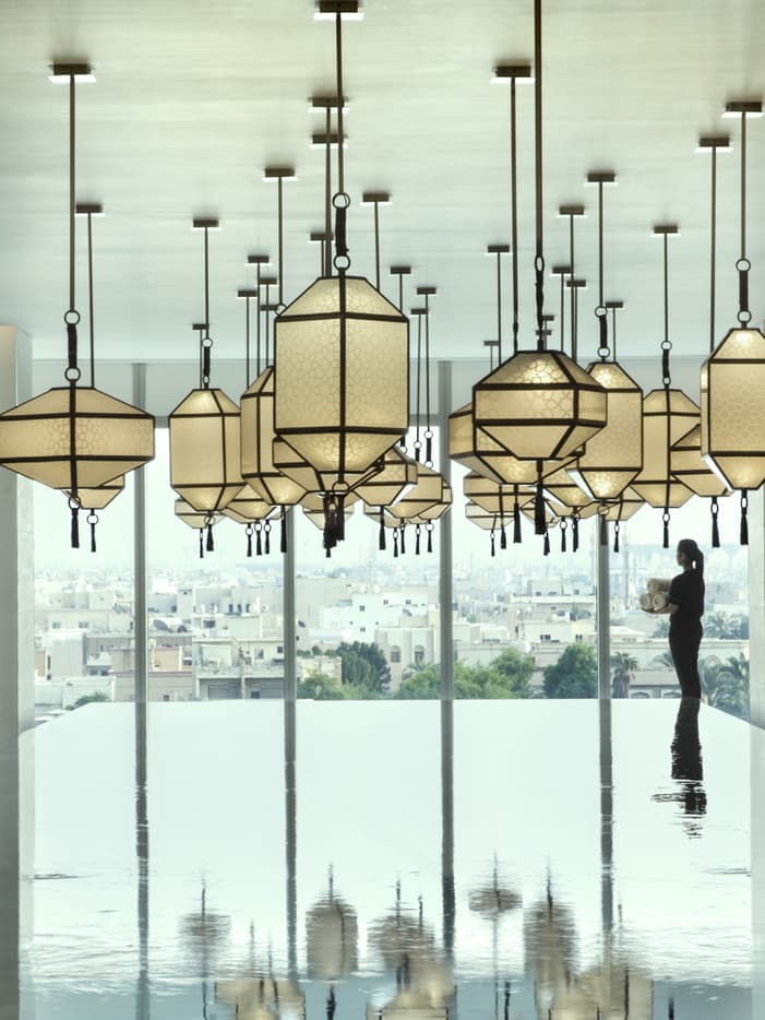 A Four Seasons member walks around the indoor pool that overlooks the city and has glass lanterns hanging overhead