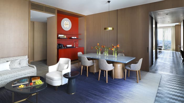 الاتصال أم الانعزال؟ لستم مضطرون للاختيار بين هذين الخيارين، لاسيما في ظل وجود هذا الجناح الرحب الذي يُمكنكم استضافة 10 ضيوف في منطقة الطعام أو الاستمتاع بأجمل الأوقات في غرفة الوسائط التي تحتوي على تلفزيون 75 بوصة أو يُمكنكم الاسترخاء في ثلاث غرف نوم ترنو بكم إلى عالم من الاستجمام والسكينة.