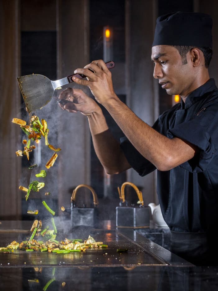 استمتعوا بالجلوس في أحد أجنحتنا الثلاثة ذات السقف القشي، والمفصولة بأحواض سباحة منعشة ومريحة، لتناول الأطباق المميزة الآسيوية والإقليمية من مطبخ التندور والكاري؛ أو انضموا إلى رئيس الطهاة على طاولة التيبانياكي في وسط الحديقة البحرية المثيرة لتناول وجبة رائعة تعد أمام أعينكم.