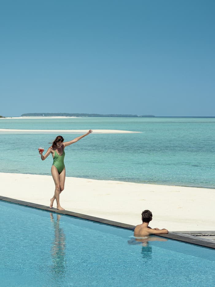 المسابح المسابح- يحتوي حوض السباحة إنفينيتي الوحيد بالحجم الأولمبي في جزر المالديف على بار بجواره ومنصة تشمّس ويكمله حوض سباحة عائم بمياه البحر وحوض سباحة بمطعم بلو عند غروب الشمس.