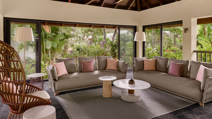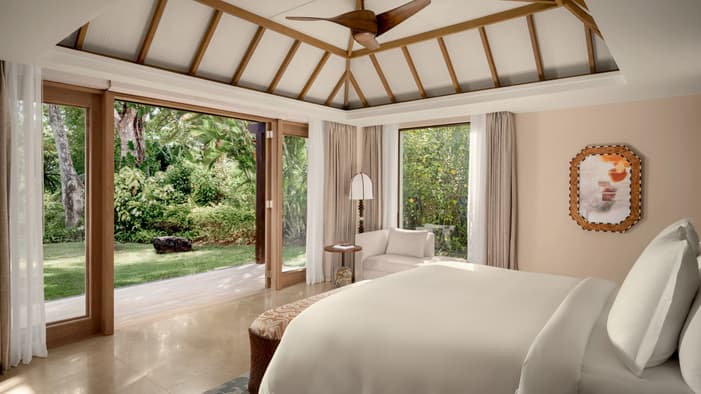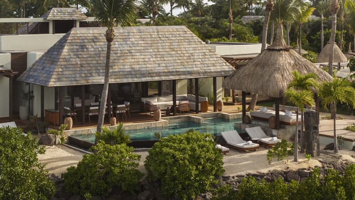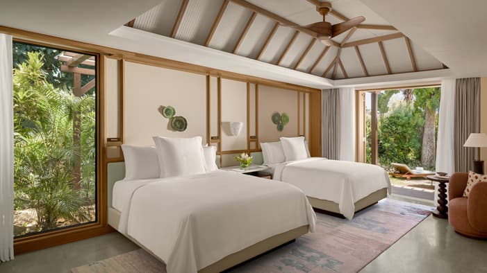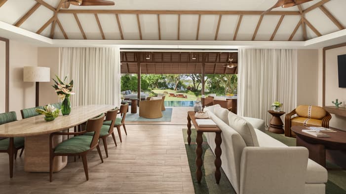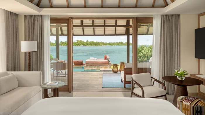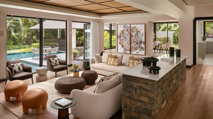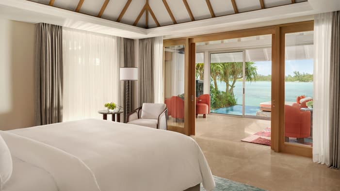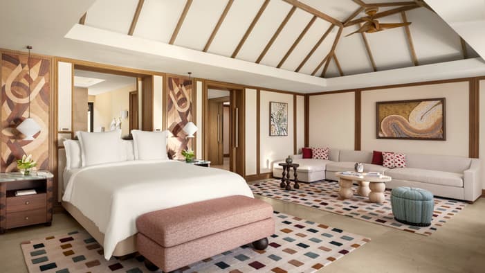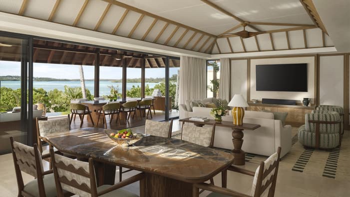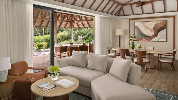 يقع جناحُنا الفخم المُكون من ثلاث غرف عند طرف الجزيرة الخاصة في المنتجع، بجوار شاطئ بامبو. ليس هناك أروع من لمّة الأهل أو الأصدقاء للاستمتاع بإجازة لا تُنسى حيث حوضي سباحة خاصّين وحوض استحمام سبا يُطل على بحيرة المحيط الهندي.