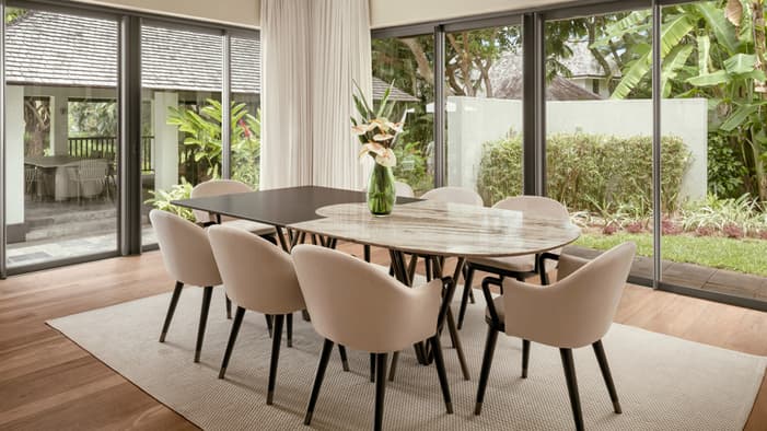تقع جميع الفيلات في مبانٍ مُستقلة بذاتها ومعها أحواض سِباحة خاصة ووحدات دش في الهواء الطلق. تُطل الشرفات الخارجية إما على الحديقة أو أشجار المانجروف أو المحيط أو على الشاطئ ذي الرمال الناعمة.