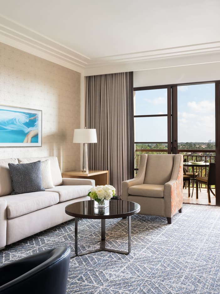 تضفي الشُرفتان والأثاث الأنيق باللونين الكريمي والبرتقالي دفئًا على هذه الأجنحة المُصممة على شكل حرف (L) والمُطلة على مجمع "جولدن أوك" السكني الفاخر والغابة المحيطة.