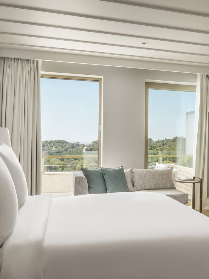 Relax into this spacious, thoughtfully designed hideaway featuring floor-to-ceiling windows and a furnished balcony overlooking the pines and some with Astir Marina view.