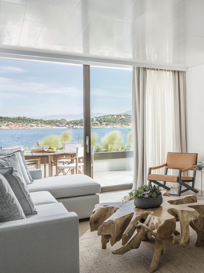 Spacious, airy and glowing with golden Aegean light, this unique one-bedroom suite welcomes with an elegant living room and a separate bedroom. The suite flows outdoors to a spacious terrace ideal for lounging, private dining and admiring the blue of the Aegan Sea.