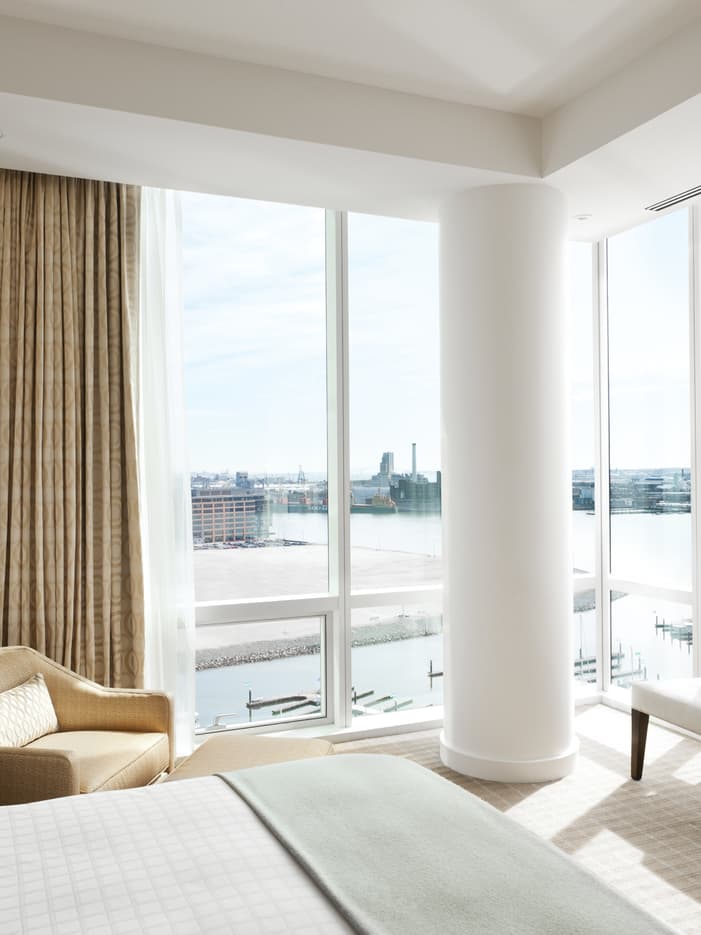Natural light fills these corner rooms, with floor-to-ceiling windows looking onto the waters of the Inner Harbor and plenty of space for two.