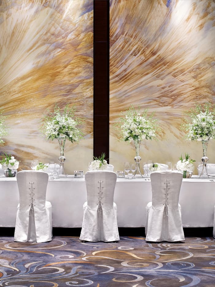 Our exquisitely designed Imperial Ballroom, spanning 988 square metres (10,635 square feet), boasts a pillarless layout that seamlessly blends modern and traditional styles. Its naturally harmonious color palette, opulent crystal chandeliers and 6.8-metre (22-foot) golden ceiling radiate an air of regal elegance. The ballroom can be divided into three independent spaces and is complemented by a spacious foyer, allowing for personalized decoration and arrangement according to your style preferences and needs.
