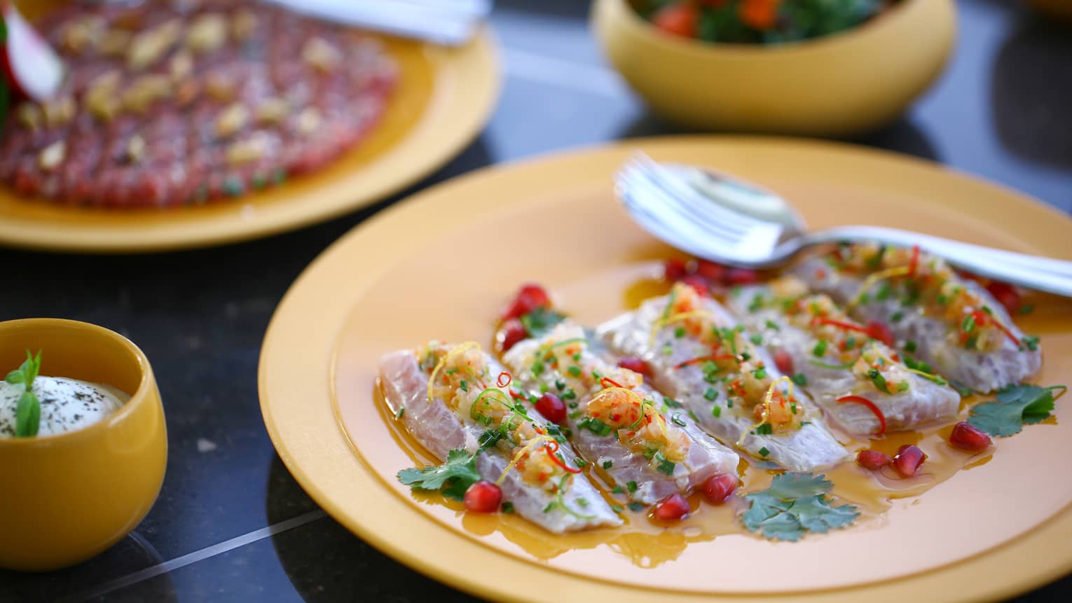 RED MULLET CEVICHE WITH POMEGRANATE, OLIVE OIL AND LEBANESE HERBS
