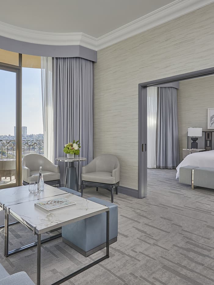 Dressed in soft pastels, this suite represents Rodeo Drive luxury and provides a sanctuary of comfort. Sliding, wooden doors separate the newly refreshed living room and bedroom in these bright and airy suites, while double-width balconies reveal incredible views of the Hollywood Hills.