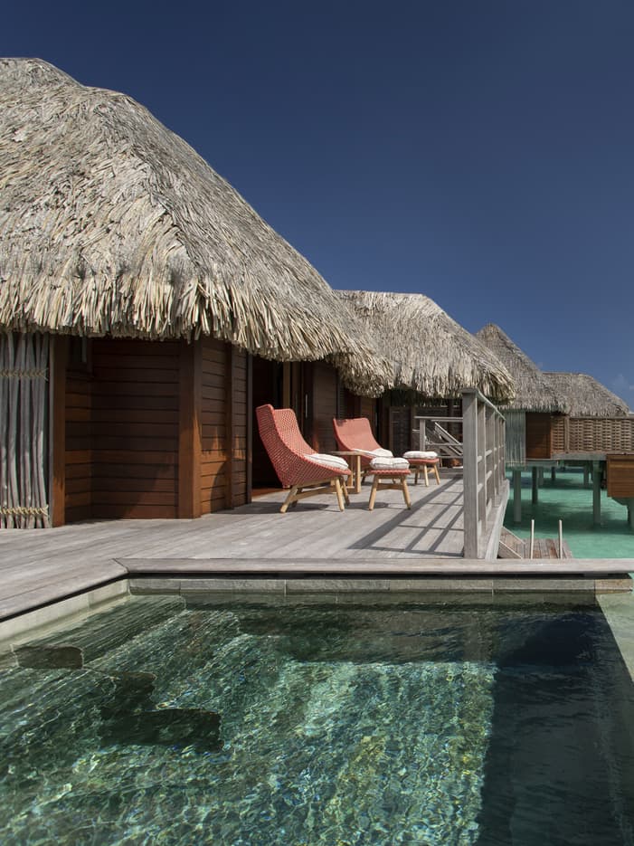 The entire family can enjoy lagoon views from the spacious deck or private plunge pool of these elegant overwater bungalows.
