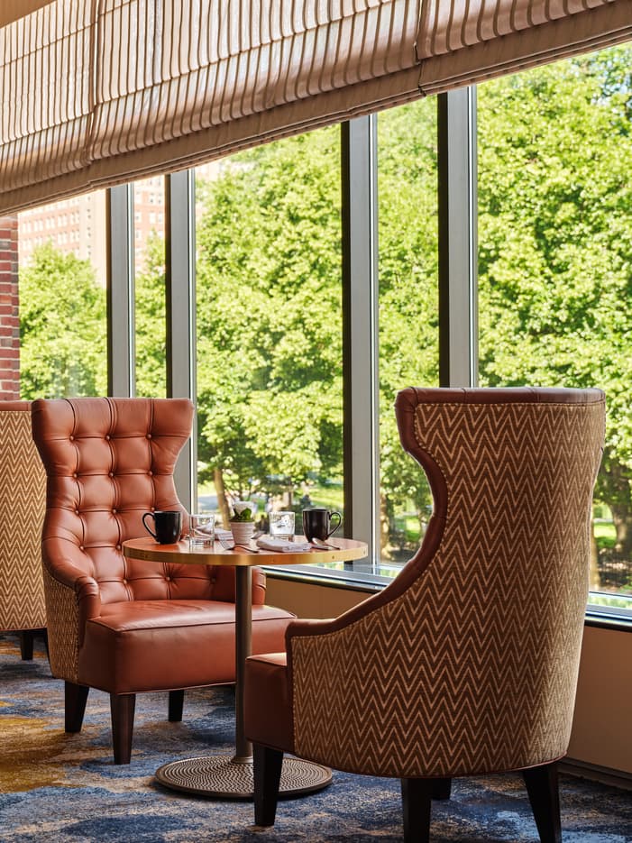 An intimate, brasserie style lobby lounge with park views showcasing classic New England dishes with a French influence and botanically inspired cocktails.