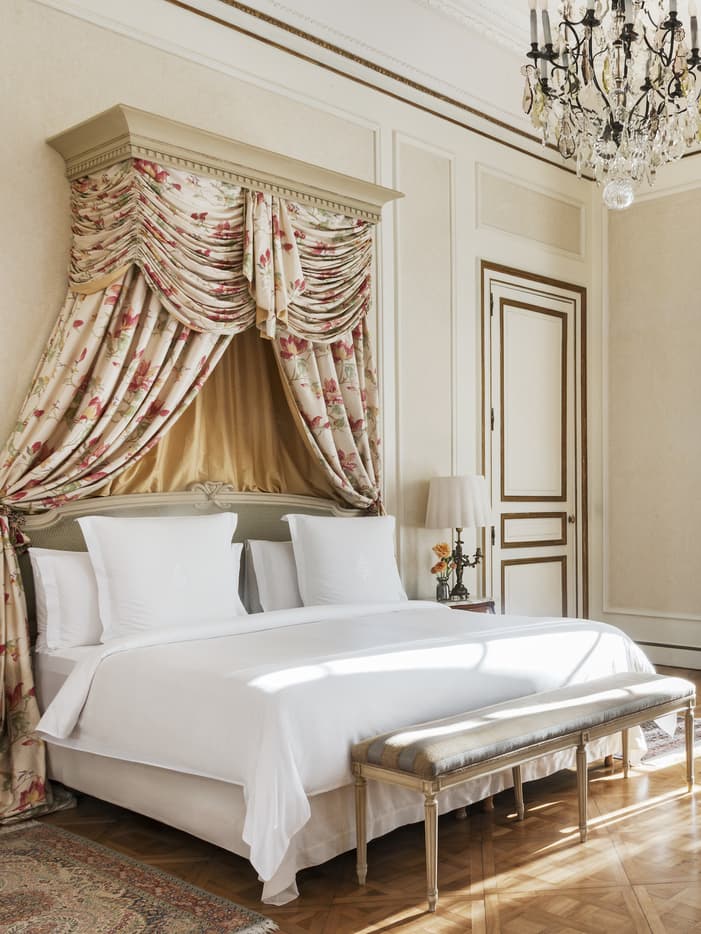 Decoração clássica francesa dos séculos 18 e 19, com tecidos finos e antiguidades autênticas. Tapetes Savonnerie e orientais repousam sobre o piso original em carvalho esloveno.