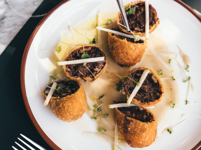 Croquetes de morcilhaServido com emulsão de maçã verde