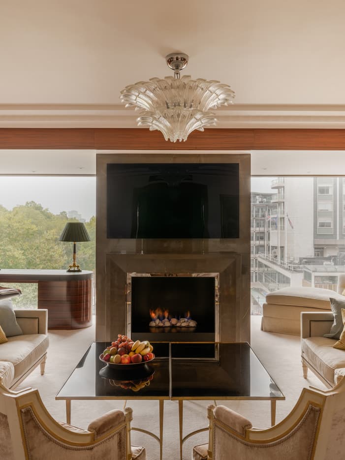 Desfrute de vistas deslumbrantes de Park Lane e do Hyde Park em nossa elegante e convidativa Suíte Presidencial no quinto andar, em Londres. Esta suíte luxuosa apresenta toques únicos, como lindos painéis de jacarandá, uma lareira privativa e área de estar para uma experiência relaxante. Com espaço para refeições para seis pessoas, é perfeita para famílias ou amigos que viajam juntos.