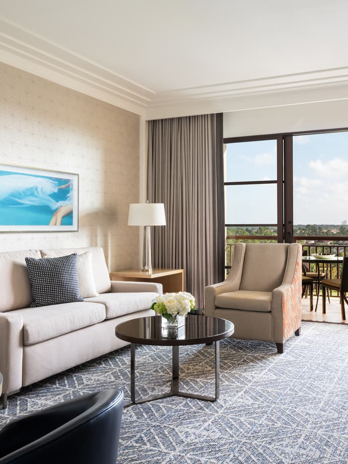 Duas varandas e móveis elegantes em tons creme e laranja dão um toque caloroso a estas suítes em forma de L com vista para o luxuoso bairro residencial de Golden Oak e para a floresta ao redor.