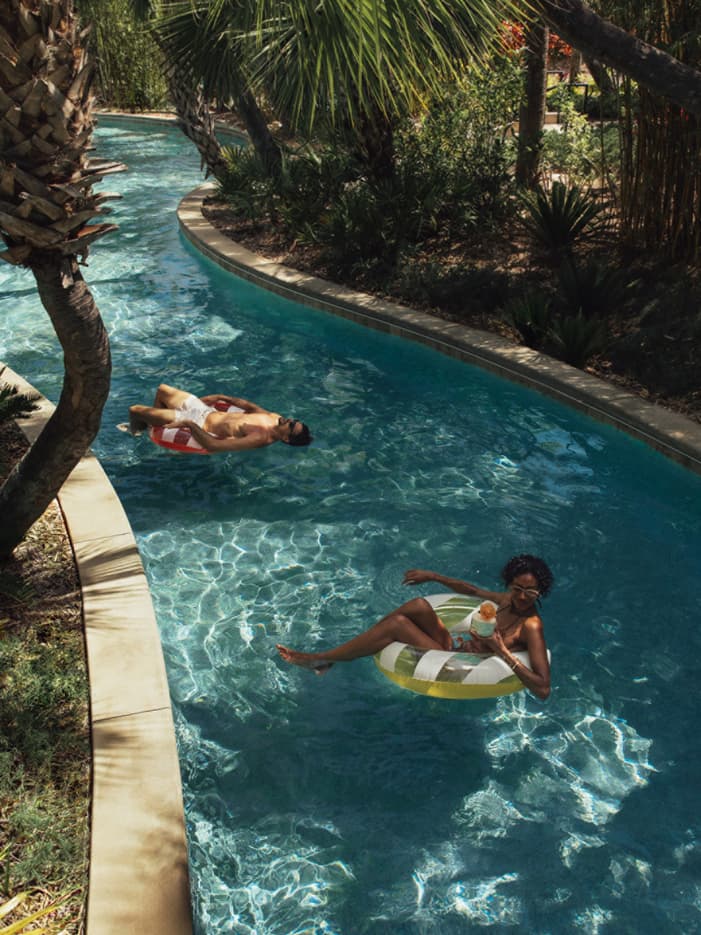 Diversão ao solPasse o dia boiando vagarosamente pelo nosso sinuoso rio artificial com correnteza, relaxando na piscina só para adultos, descendo dois escorregadores aquáticos eletrizantes ou jogando vôlei na quadra poliesportiva de grama na Explorer Island. Tanto crianças quanto adultos se divertem muito na Splash Zone e no salão de games The Hideout. Cabanas particulares estão disponíveis para reserva para um retiro ainda mais afastado.