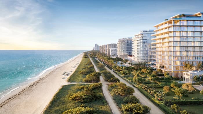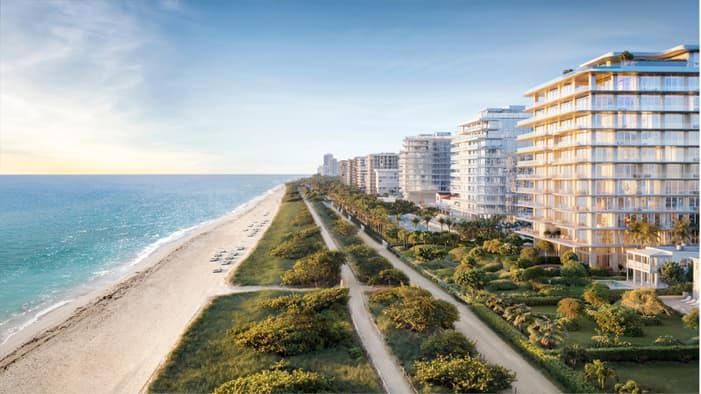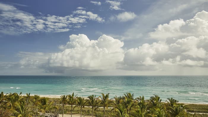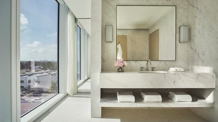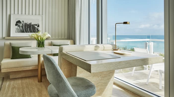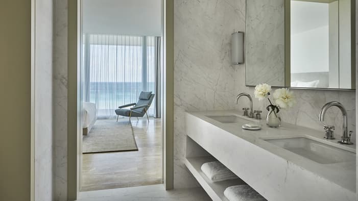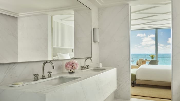 O designer de interiores parisiense Joseph Dirand criou uma paleta de cores agradável, misturando tons suaves de verde-claro, azul e mármore branco para garantir que cada acomodação reflita a clássica combinação de areia, mar e sol de Surfside