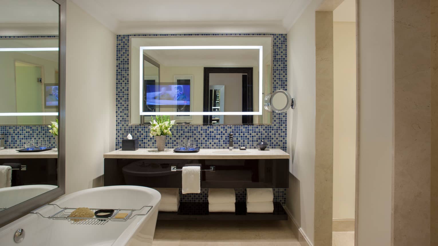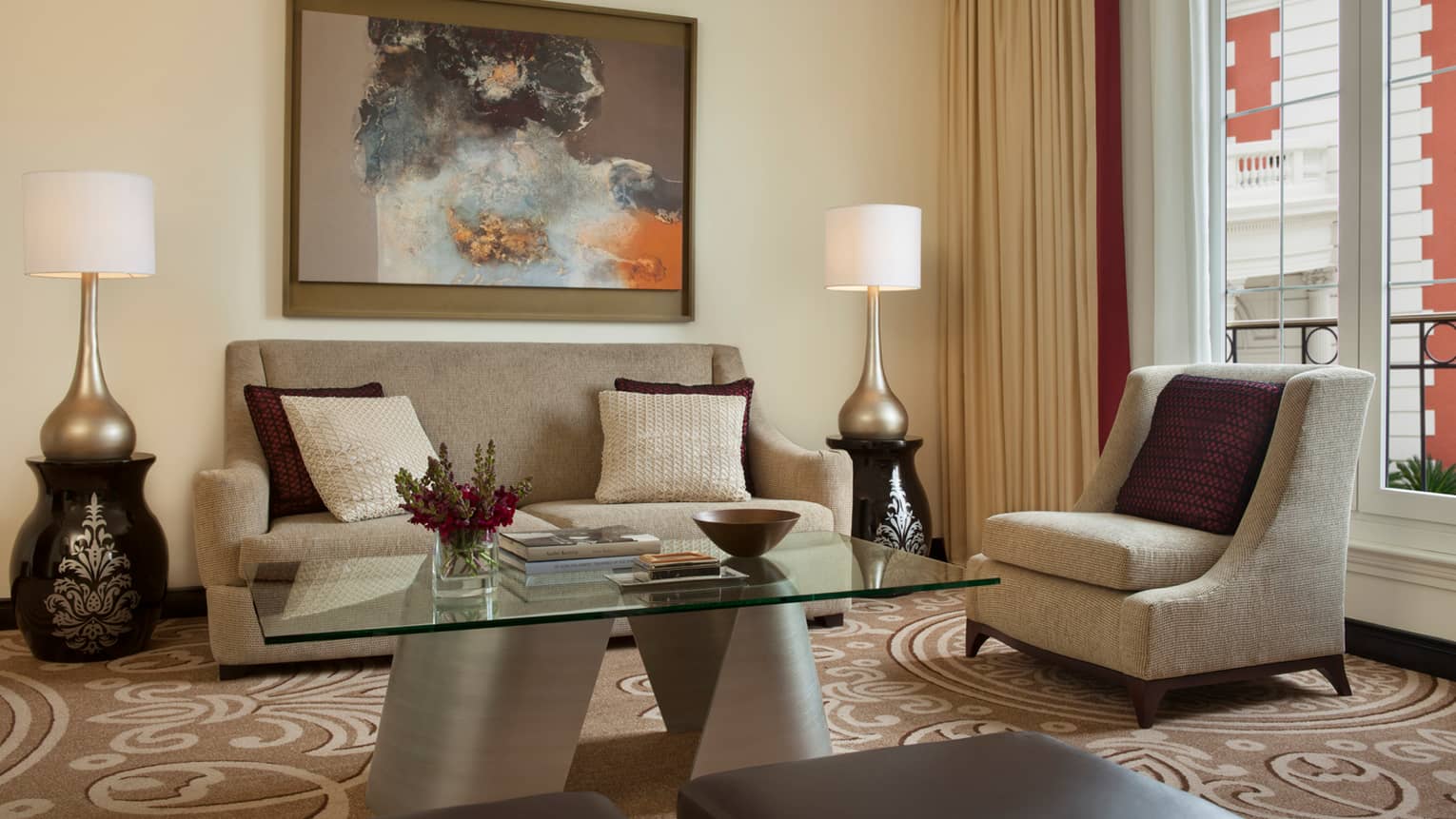 In this light-filled suite, an elegant console separates the bedroom and the living room, allowing the television to be viewed from either space. E-Lounge accommodations are located on a dedicated floor with exclusive access to the E-Lounge, our intimate lounge featuring a balcony, refreshments and additional perks.