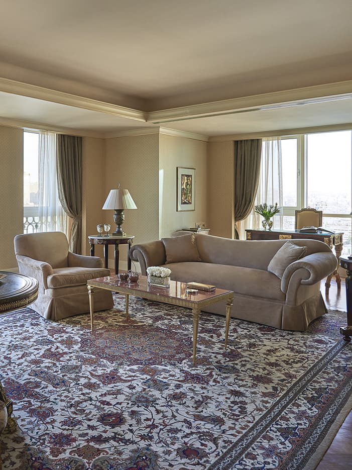 Perched high on our 15th through 18th floors, our Presidential Suites are bathed in natural light from the floor-to-ceiling windows that offer 180˚ views of Cairo at almost every turn. Original artwork hangs on the walls, and gleaming hardwood floors lead you through the living and dining rooms, study and three Empire-style bedrooms.