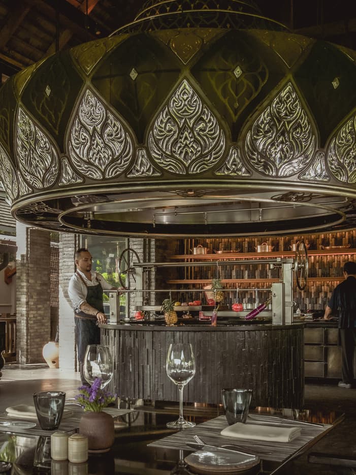 Designed by renowned architect and landscaper Bill Bensley, our restaurant and cooking studio is where our Chiang Mai cooking classes take centre stage. Housed in a charming Thai teak house, this culinary destination celebrates traditional Lanna elegance. Join the cooking class or experience the intimate Chef’s Table in the open-air pavilion overlooking a waterfall with sweeping tropical views.