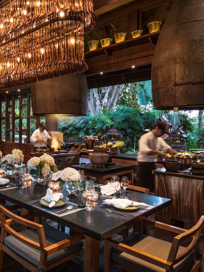 Designed by renowned architect and landscaper Bill Bensley, our restaurant and cooking studio is where our Chiang Mai cooking classes take centre stage. Housed in a charming Thai teak house, this culinary destination celebrates traditional Lanna elegance. Join the cooking class or experience the intimate Chef’s Table in the open-air pavilion overlooking a waterfall with sweeping tropical views.