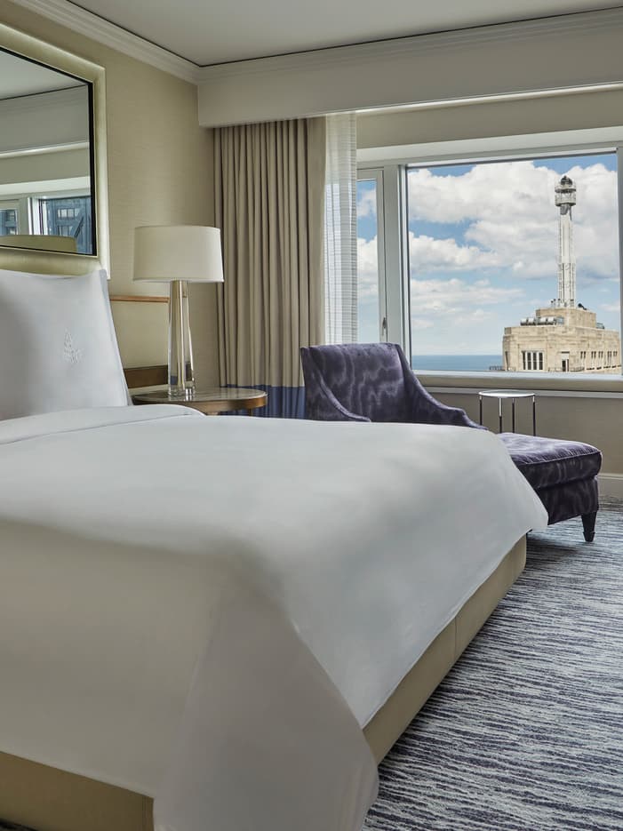Oversized windows fill these spacious guest rooms with natural light while offering an impressive view of Lake Michigan.