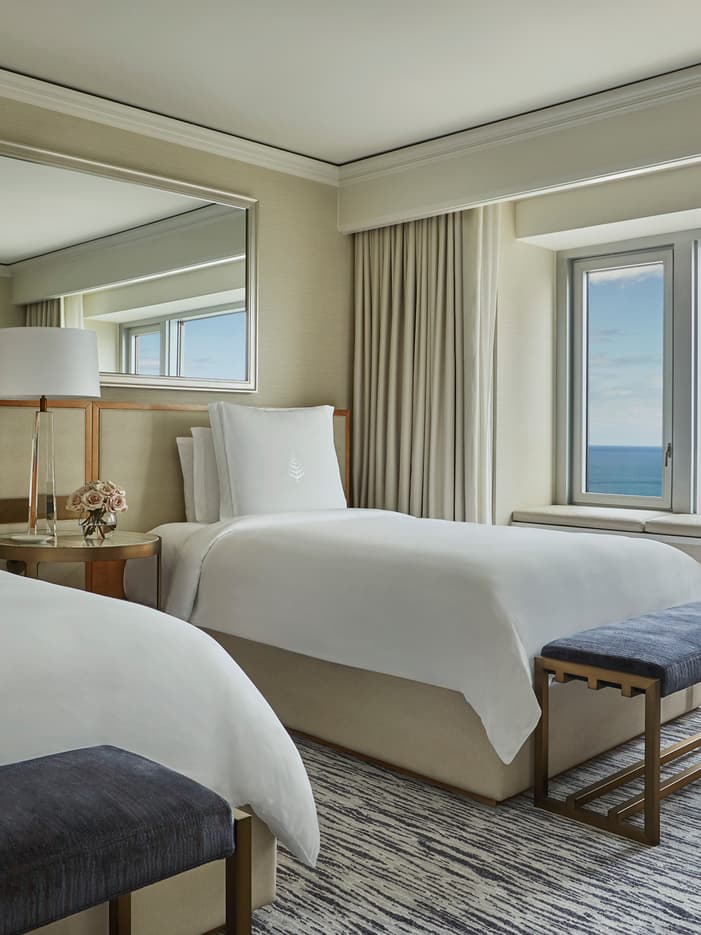 Oversized windows fill these spacious guest rooms with natural light while offering an impressive view of Lake Michigan.