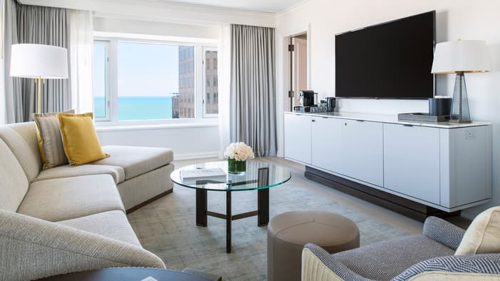 A dramatic entryway of charcoal and grey handpainted wallpaper greets you in our Premier Suites. Walk further inside to experience a sense of calm thanks to warm neutral and stone hues, with views of Chicago and Lake Michigan through your windows.