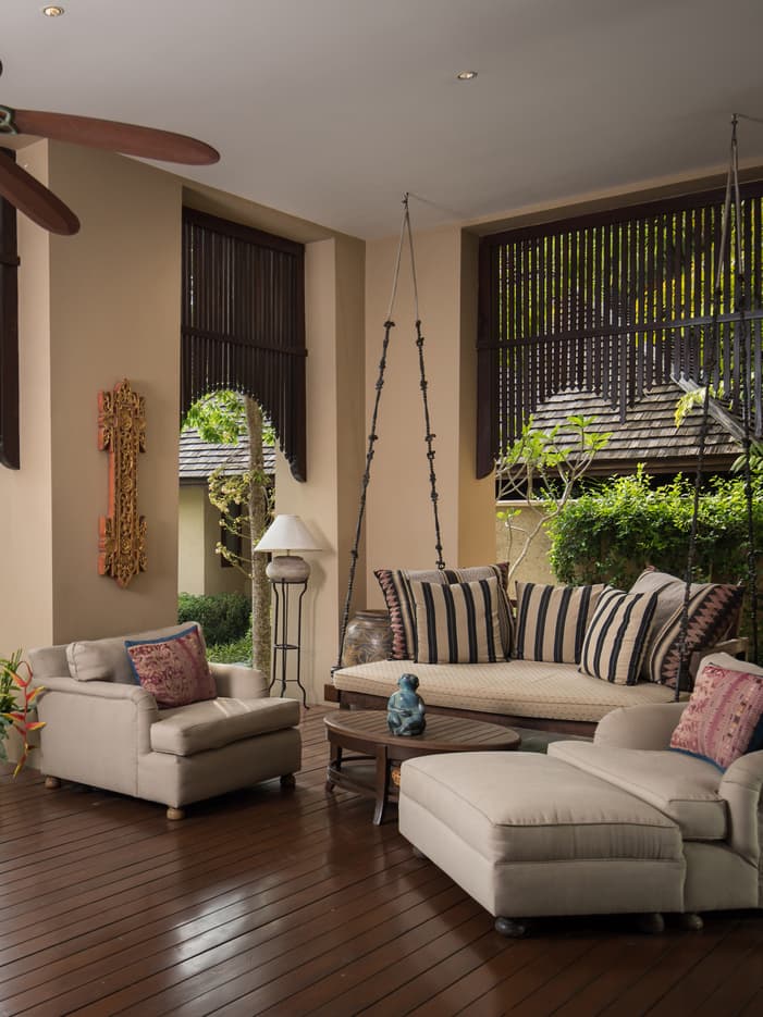 Zeitgemäße Interieurs im südthailändischen Stil mit Möbeln aus Teakholz und Palisander verleihen dieser Residenz ein rustikales Ambiente, mit eigens angefertigten Kunstwerken und Dekorationen aus thailändischer Seide.