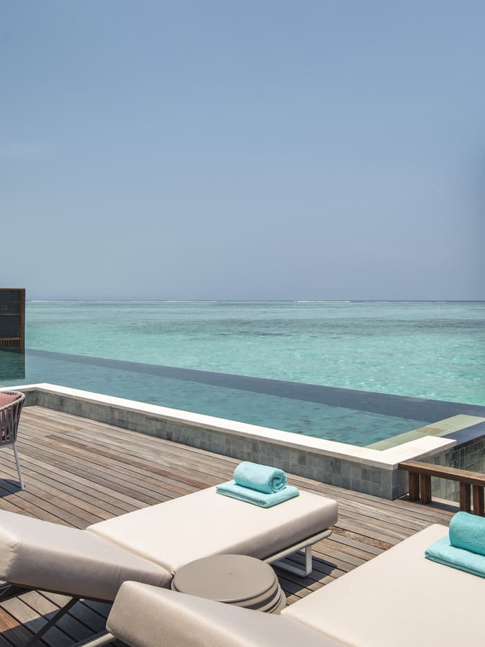In unserer luxuriösen Suite direkt am Wasser mit drei Schlafzimmern und Blick auf den Sonnenaufgang erleben Sie die Evolution im modernen Stelzenbau in unserer ultimativen Unterbringung direkt am Ozean. Näher am Wasser geht nicht!