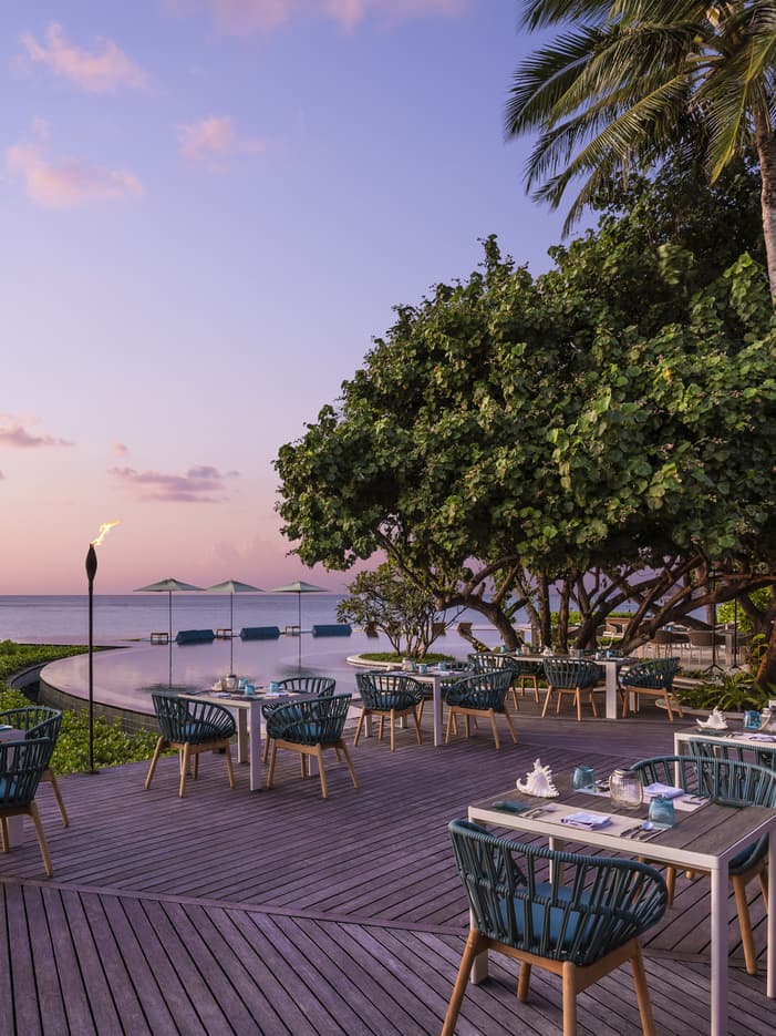 Im Schatten eines traditionellen maledivischen Pavillons mit Strohdach genießen unsere Gäste eine Reihe beliebter europäischer und asiatischer Gerichte.