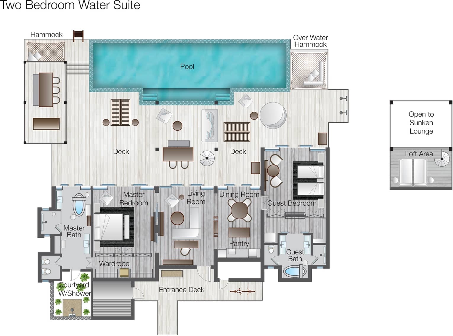 - 15-Meter-Schwimmbecken und Terrasse mit Hängematten über dem Wasser und direktem Zugang zur Lagune