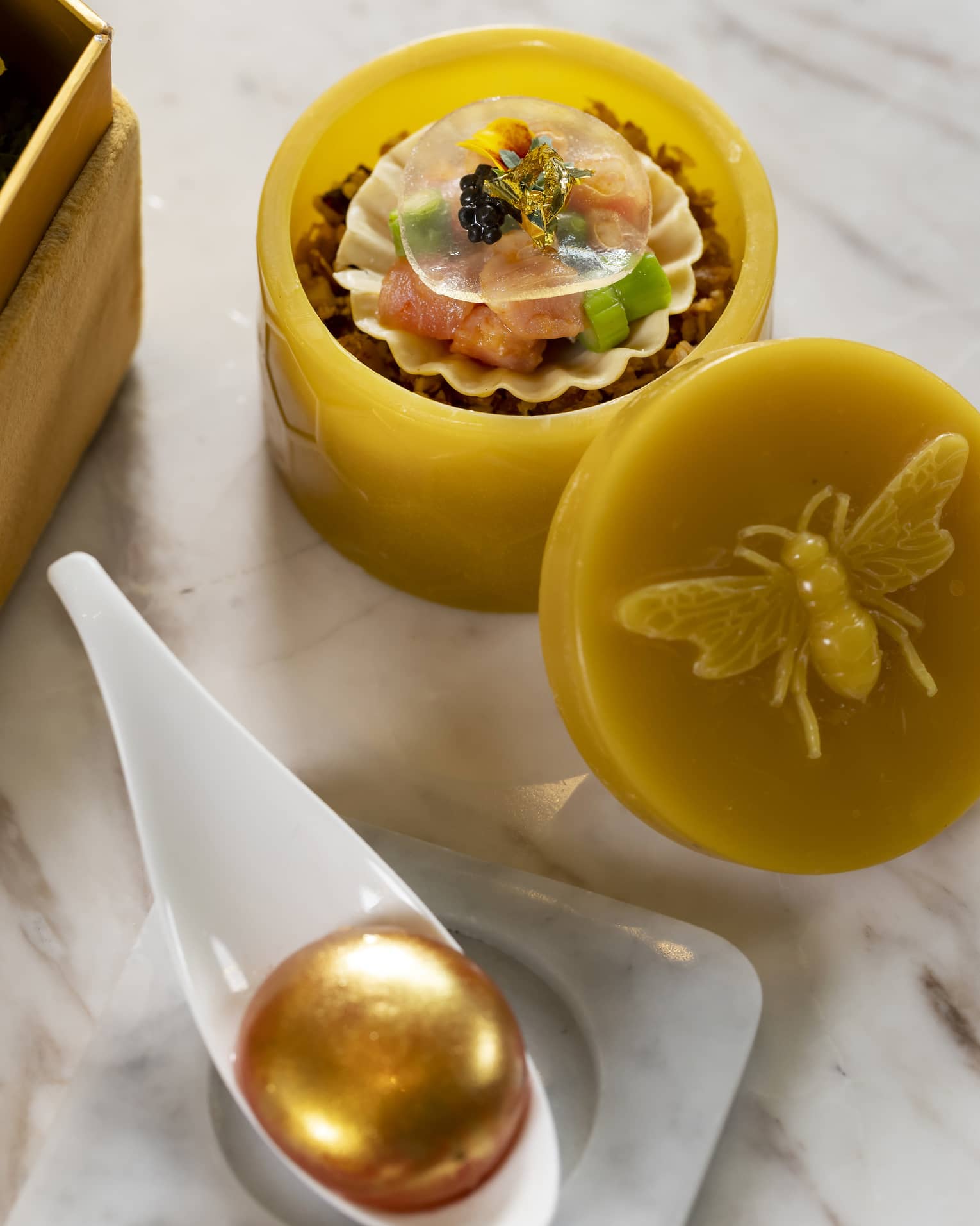 Celebrate the New Year with a reimagined Galette des Rois by Chef Nicolas Lambert. Delicate layers of caramelized puff pastry are crowned with luscious pistachio–almond frangipane and soft salted caramel filling, with a hidden charm inside for the lucky finder.