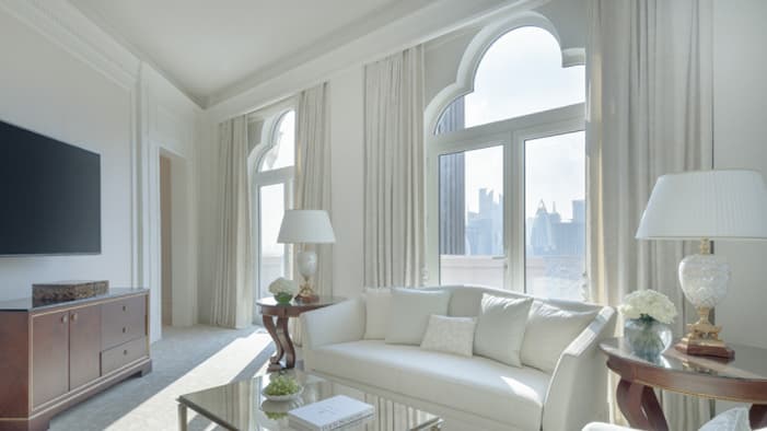 Befitting heads of state and VIPs, this magnificent two-bedroom suite wraps around two sides of the tower for truly panoramic views. Entertain in the majiles-style living room, including a grand piano and a dining table for ten.