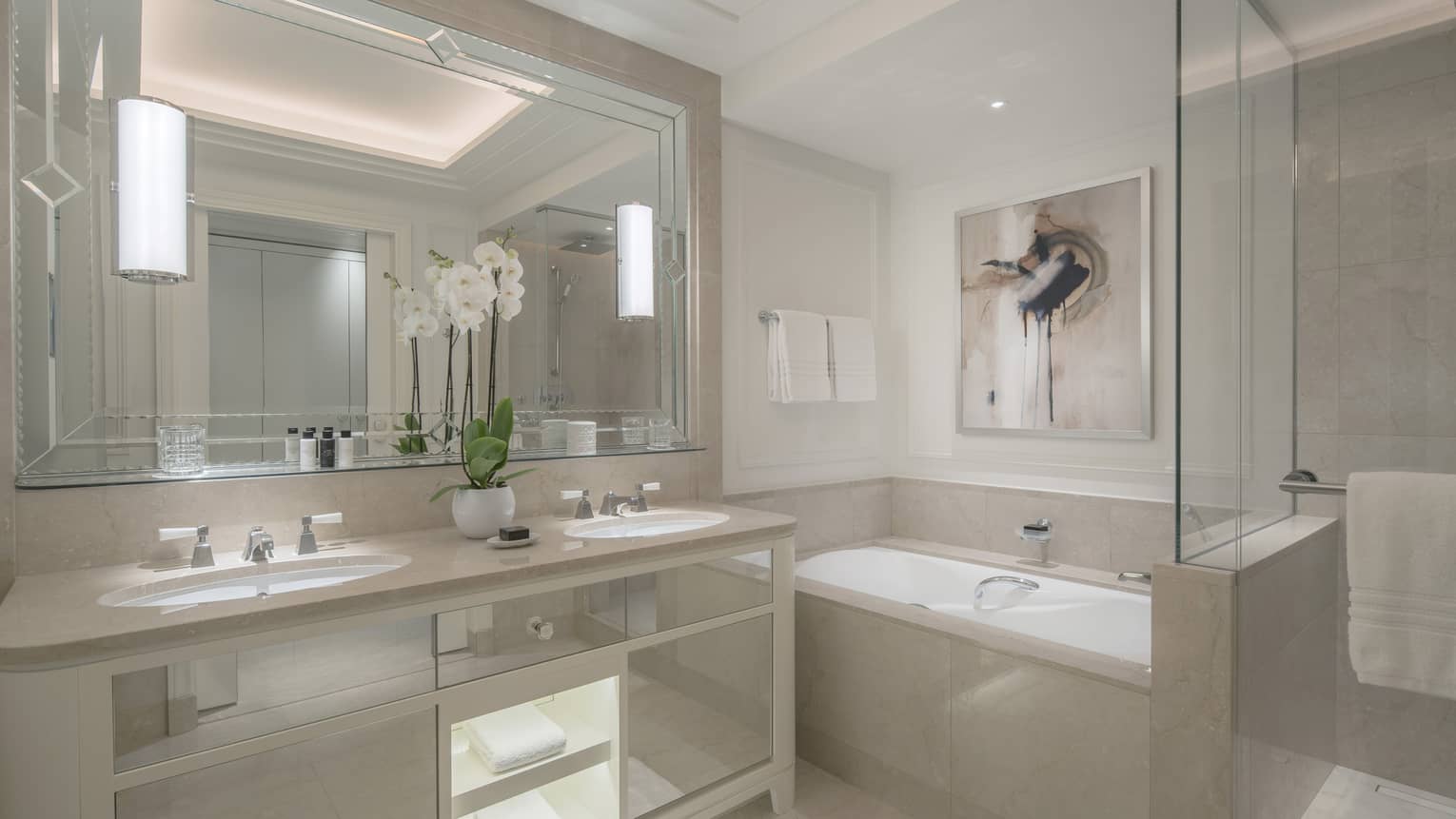 One full marble bathroom, including two sinks, deep soaking tub and separate shower