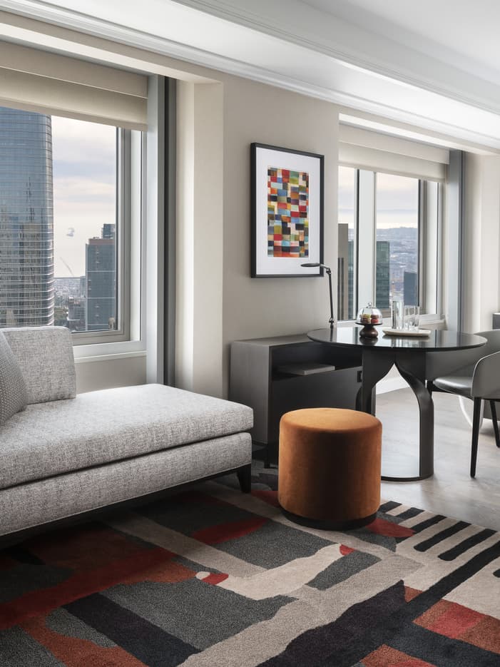 Desk/dining table for two; sofa for lounging; some outer-connect to a Bay-View Corner Suite or a Golden Gate-View Corner Suite