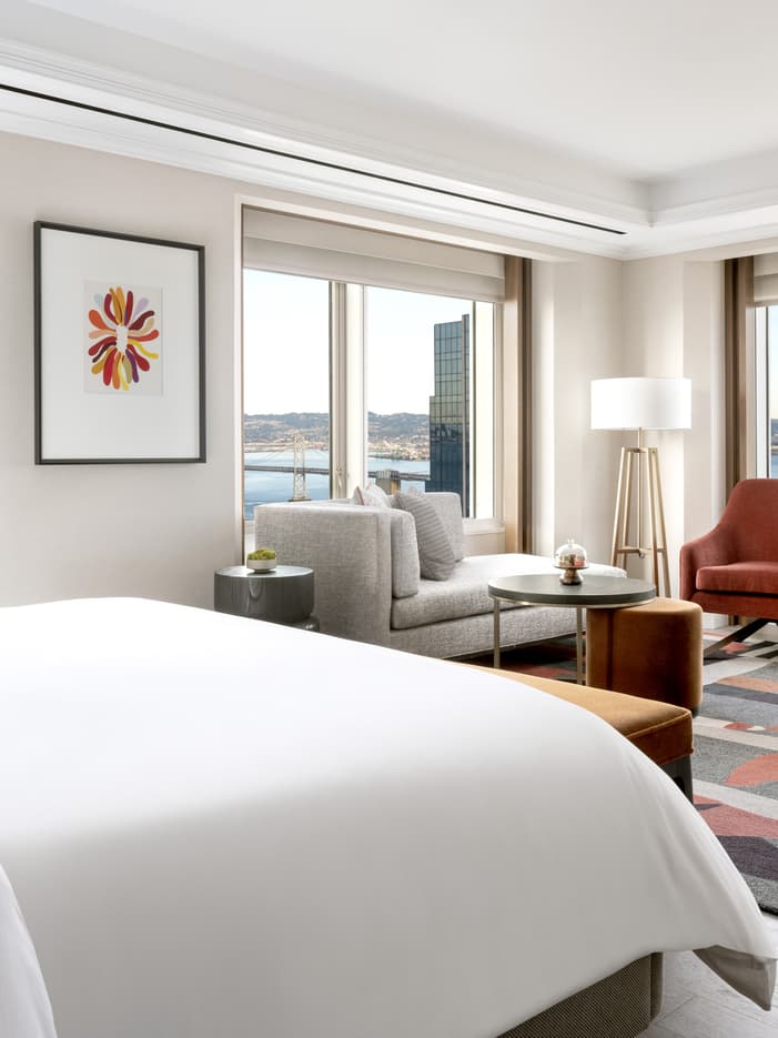 Enter an urban oasis with the expansive two-bedroom Embarcadero Suite. An intimate residential alcove outer-connects two bedrooms and leads to either a Bay-View Corner Suite with a Deluxe King Room; or a Golden Gate-View Corner Suite with Deluxe King Room. With an open-concept, studio-style layout, this smartly designed suite brings all your attention to the stunning San Francisco Bay and the city’s most famous landmarks right outside your window. Each suite offers 1,000 square feet of space for virtual meetings or relaxation.