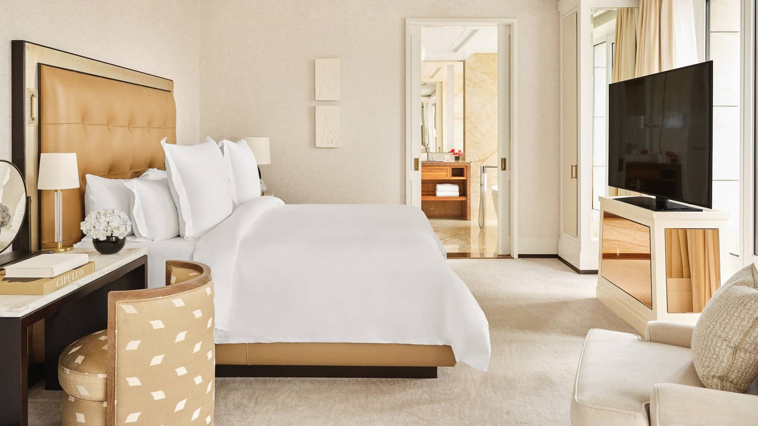 En nuestro planta más alta, en la parte angular del edificio, esta suite de una habitación es una residencia glamurosa para recibir invitados o disfrutar de una estancia prolongada. Los lujosos interiores están enmarcados por dos grandes terrazas, perfectas para comidas al aire libre o una copa al atardecer con vistas a la ciudad. Con acceso a su propia terraza, el dormitorio cuenta con un espectacular baño iluminado por el sol, con una bañera ovalada independiente.