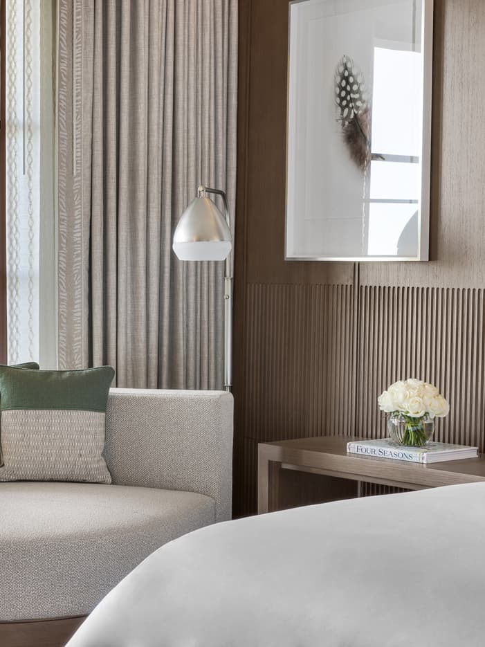 Los detalles en madera oscura, la decoración en tonos de azul claro y acentos verdes evocan las plácidas vistas al lago que rodean estas amplias suites, que con su sala de estar independiente del área de dormitorios, dos baños y comedor, son ideales para familias que buscan un remanso de paz.