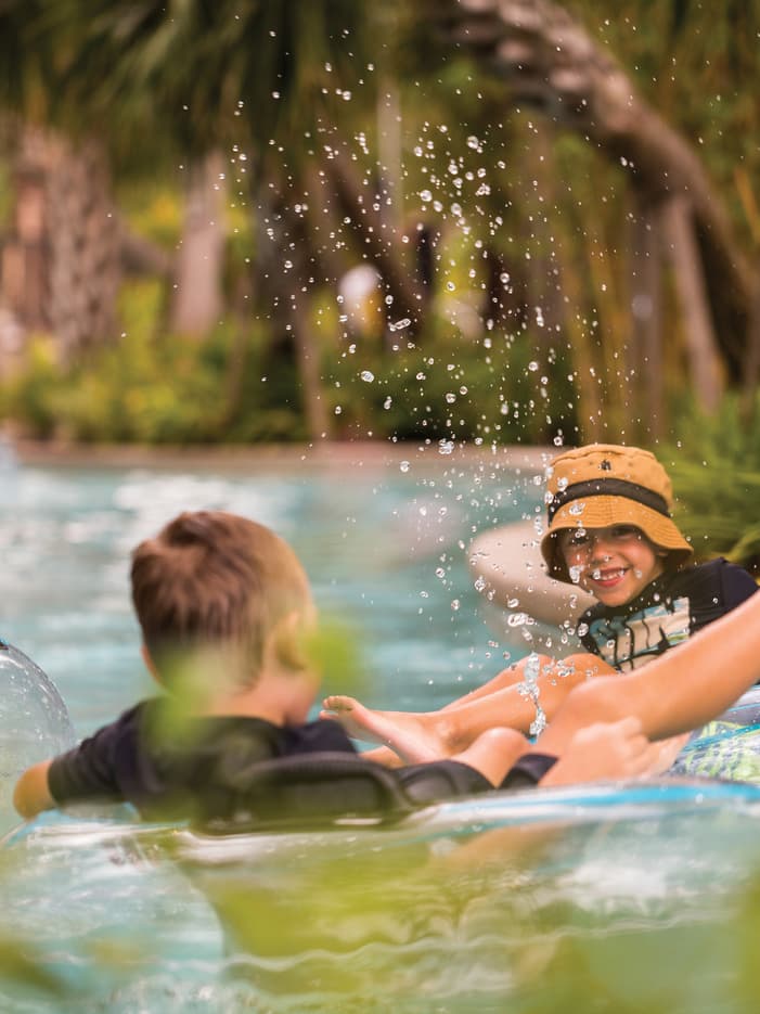 Río perezosoNuestro río perezoso no es un río normal. Cuenta con dos cañones de agua a baja impulsión, una cascada de 2.75 metros (9 pies) y una sección de rápidos espumosos y burbujeantes, que ofrecen una diversión increíble a los niños y también a los adultos con alma de niño.
