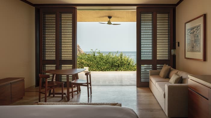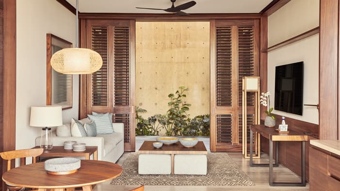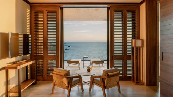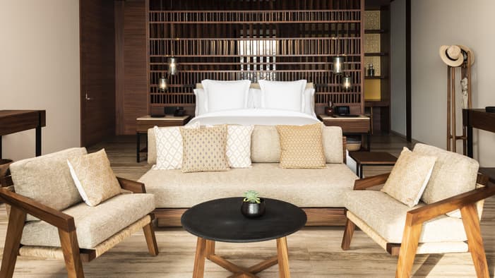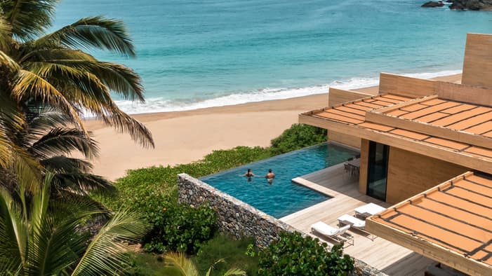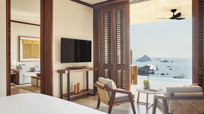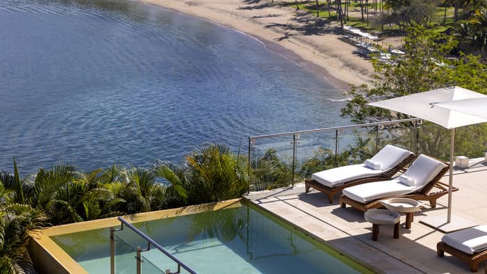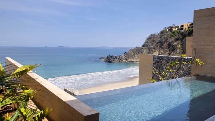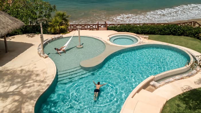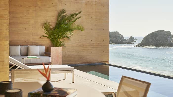 Estancia ideal para los amantes de la playa. Estas amplias suites cuentan con distintas áreas de estar, comedor y dormitorio. Disfrute de los días bajo el sol junto a su propia piscina infinita ubicada sobre la arena, con vistas a la playa y al océano.