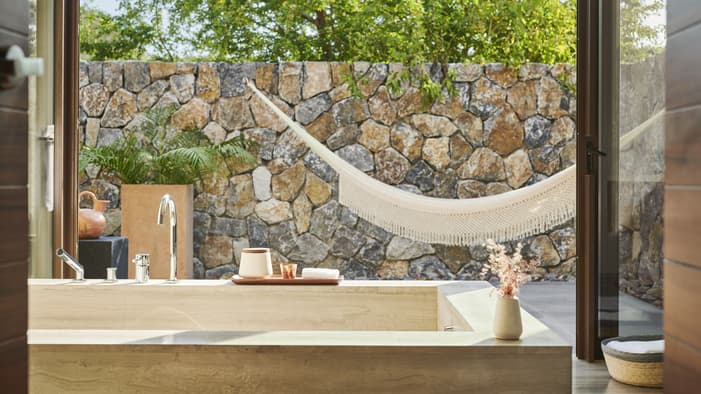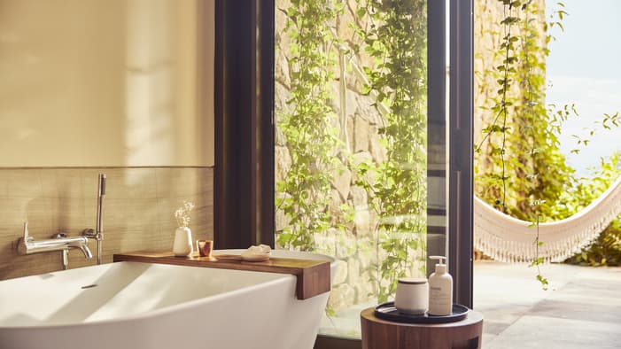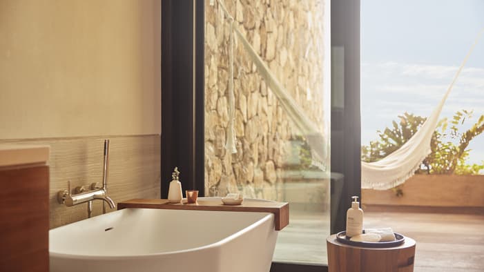 Deje que el sonido de las olas lo arrulle hasta dormir para luego despertarse ante una gloriosa vista de la playa. Relájese en su hamaca o disfrute de un baño con vista al mar: una experiencia fenomenal frente al mar.